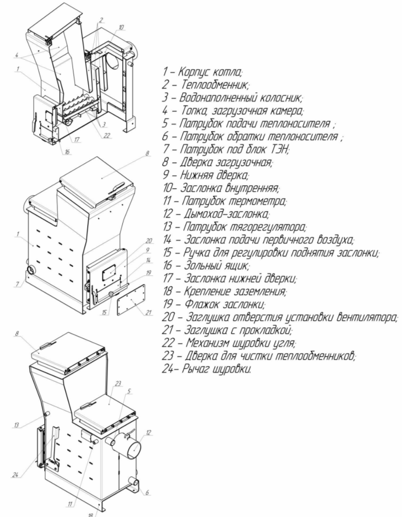 - Корпус котла внутренняя и наружная рубашка, теплообменники, выполнены из стали толщиной 6 = 4 мм;